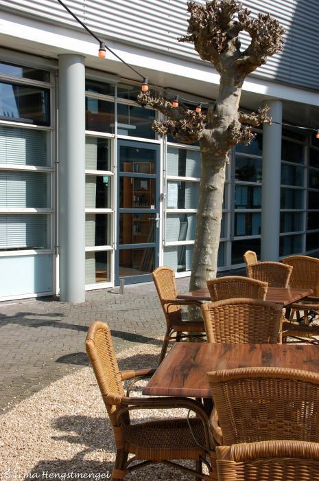 Terras van restaurant Boekmans aan de personeelsingang van Bibliotheekvestiging Stadspolders
