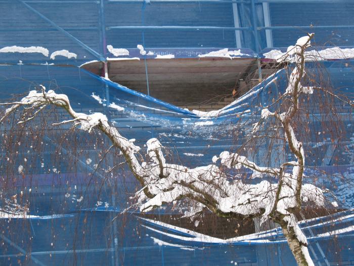 Sfeerfoto van een bouwsteiger in de sneeuw
