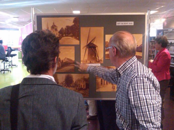De heer T. Rijsdijk van de Oudheidkamer geeft uitleg bij de tentoonstelling Oud Ridderkerk in de bibliotheek