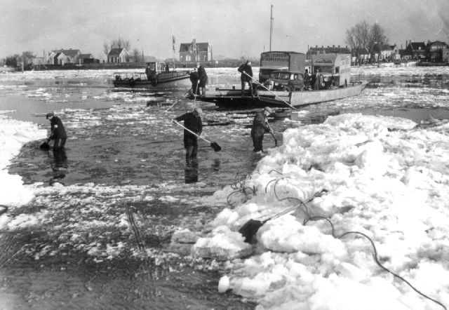 Op de foto zijn de de veerlui bezig de aanloopgeul voor de pont op de Ridderkerkse wal ijsvrij te maken opdat de klep neer kan en de wagens kunnen afrijden. Op den duur moest men het opgeven en toen de Noord geheel dicht zat, kon men naar de andere zijde rijden en lopen. De veerdienst zorgde voor een afgebakende, met zand bestrooide baan. Er is toen door Henk Vos, Cor Groenendijk, Stuurman, Van Vliet en De Jong zwaar en gevaarlijk werk verzet.