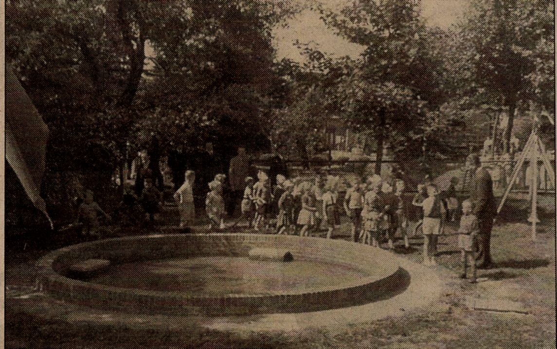 Naast de grote speeltuin lag, ter hoogte van het pompstation, verbonden met een bruggetje de kleuterspeeltuin met kleine speeltoestellen en een vijver. Als het heel mooi weer was werd die gevuld met water en dan maar spetteren en spatteren.