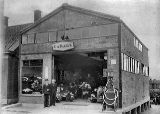 Op deze foto het stenen pand dat het houten pand verving. Ook hier Nico Wensveen en Tinus de Zwart op de foto. stonden de ambulances en taxi's gestald