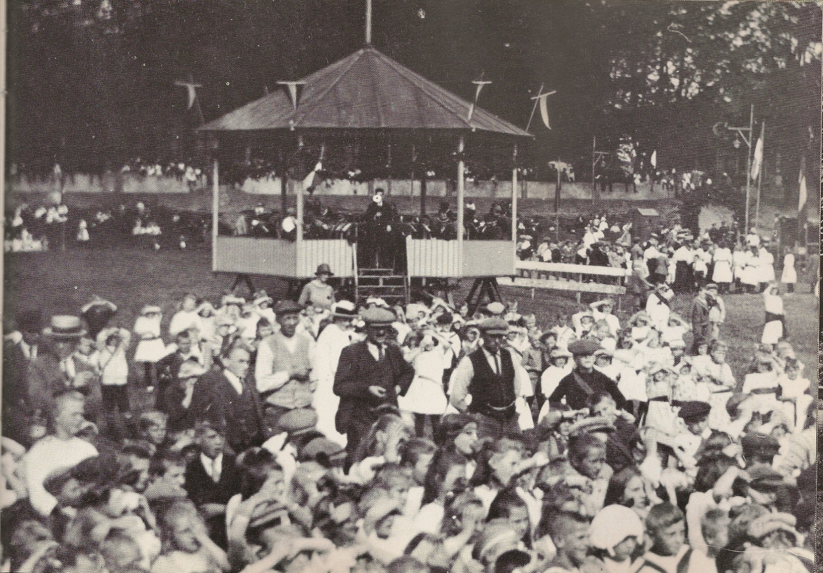 Het aloude feestterrein lag in de buitenpolder Cortgene. Dit was het laatste lage stuk overgebleven grasland tussen dijk en zomerkade. Het was jarenlang bezit van de familie Rijkee, die het land verhuurde aan diverse eigenaren van een paard of een koe, zoals molenaar Struitenburg van het Stek. Ook – en dat is uit onze kinderjaren in het geheugen gegrift - stond daar in de kermisweek en tijdens paardenmarkt de grote stoomcarrousel van JanVier en soms ook de grote komedietent, die te groot was om op de Dam geplaatst te worden. In 1898 werd hier het inhuldigingsfeest van koningin Wilhelmina gehouden, toen het Oranjecomité de dorpsgenoten voor het laatst liet genieten van het barbaarse spel dat bestond uit het grijpen van met groene zeep ingesmeerde biggen, waarbij de misgrijpende deelnemers soms in de sloot belandden. Ook de latere eigenaar van het grasland, de heer Jan Smit, stelde jaarlijks het terrein beschikbaar aan de Oranjevereniging om te feesten, zoals deze foto uit 1923 laat zien. Nu staat hier het raadhuis en maken we voor feesten en demonstraties gebruik van het Raadhuisplein. Uit: Wie kent ze nog…de Alblasserdammers. Geplaatst door Bastiana Bouman