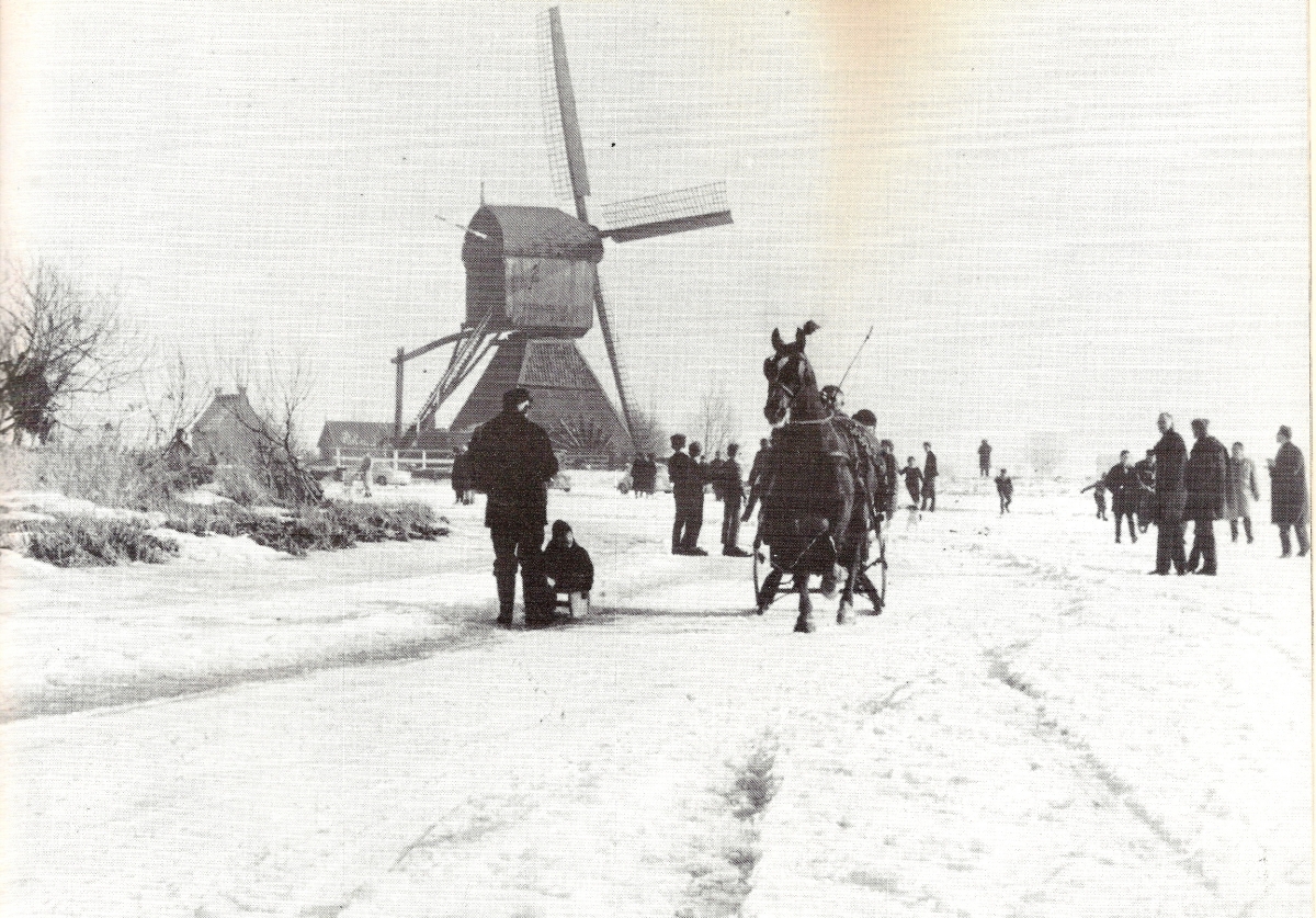 De molentocht voor arresleden georganiseerd door AIJC. In totaal 50 tikkers nemen deel aan het 15 km lange parcours van en naar de Kinderdijk.Hier ziet u een van de deelnemers nabij de 'Blokkerse Wip'. Het met sneeuw afgedekte ijs schitterde in het zonlicht. Uit: “Honderd jaar ijsplezier”, uitgegeven door de Klaroen ter gelegenheid van het honderd jarig bestaan van de Alblasserdamse IJsclub AIJC. Geplaatst door Bastiana Bouman – Vos.