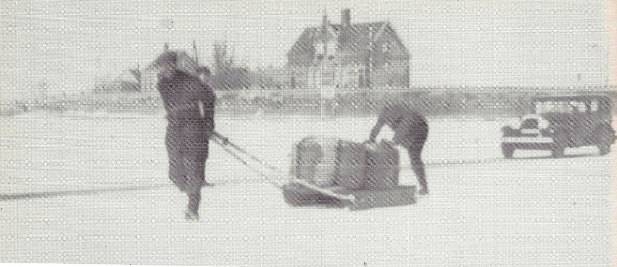 Het 'Vosseveer' was buiten bedrijf en ook de schietschouw was inmiddels verdwenen. Het ijs bereikte die winter een dikte van 60 tot 100 cm. De goederen werden met een slee door de veerlieden overgebracht. Hier vervoerden zij een zware rol touw van de lijnbaan Straat Sunda, nu Nederlandse Touwfabrieken. De Chevrolet passeerde het veer op eigen kracht. Op de achtergrond het toenmalige Groene Kruisgebouw van de gemeente Alblasserdam, waar nu al 30 jaar de voorzitter van AYC, Jaap van Driel woont. Uit: “Honderd jaar ijsplezier”, uitgegeven door de Klaroen ter gelegenheid van het honderd jarig bestaan van de Alblasserdamse IJsclub AIJC. Geplaatst door Bastiana Bouman – Vos.
