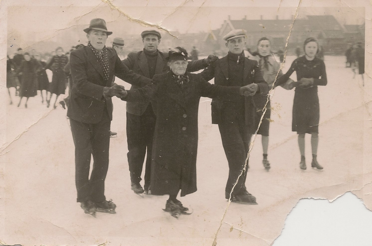 'Jong, geleerd, oud gedaan' dit spreekwoord was op mevrouw Van Meerburg zeker van toepassing. Deze dame liet geen kans onbenut om de schaatsen onder te binden en zelfs op zeer hoge leeftijd kwam men haar op de gladde ijzers tegen. Hier wordt zij geflankeerd door Jo en Teuntje Kloot. Geplaatst door Corrie den Ouden - den Boef. Mevrouw Meerbug was haar oma.